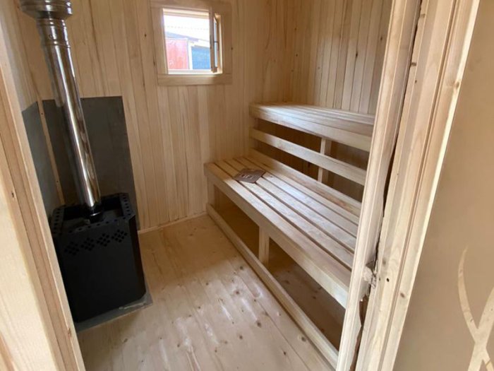 • Перегородки — доска 25 мм или вагонка на деревянном каркасе. Дверь в парилку — деревянная, без металлических элементов, открывается наружу.